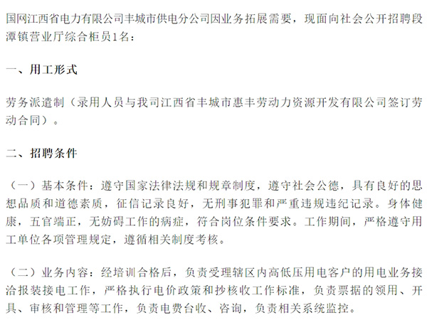 國網(wǎng)江西省電力有限公司豐城市供電分公司因業(yè)務(wù)拓展需要,現(xiàn)面向社會公開招聘段潭鎮(zhèn)營業(yè)廳綜合柜員1名:一、用工形式勞務(wù)派遣制(錄用人員與我司江西省豐城市惠豐勞動力資源開發(fā)有限公司簽訂勞動合同)。二、招聘條件(一)基本條件:遵守國家法律法規(guī)和規(guī)章制度,遵守社會公德,...